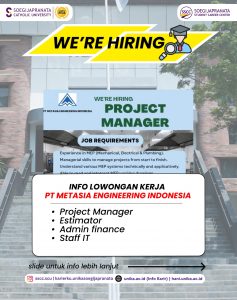 PT. Metasia Engineering Indonesia sedang mencari profesional muda yang siap berinovasi dan berkolaborasi. Jangan lewatkan kesempatan ini! Info lebih lanjut kunjungi hani.unika.ac.id dan klik menu “Jobs” untuk melihat info secara lebih jelas.