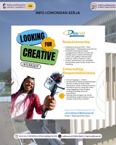 PT. DES TEKNOLOGI INFORMASI (DESNET) sedang mencari profesional muda yang siap berinovasi dan berkolaborasi. Jangan lewatkan kesempatan ini! Info lebih lanjut kunjungi http://hani.unika.ac.id dan klik menu “Jobs” untuk melihat info secara lebih jelas.