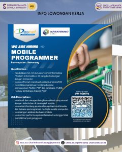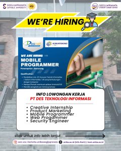 PT. DES TEKNOLOGI INFORMASI (DESNET) sedang mencari profesional muda yang siap berinovasi dan berkolaborasi. Jangan lewatkan kesempatan ini! Info lebih lanjut kunjungi http://hani.unika.ac.id dan klik menu “Jobs” untuk melihat info secara lebih jelas.