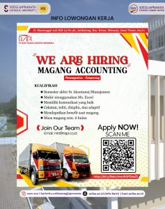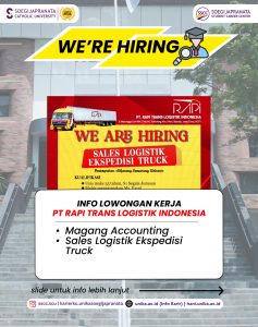 PT Rapi Trans Logistik Indonesia sedang mencari profesional muda yang siap berinovasi dan berkolaborasi. Jangan lewatkan kesempatan ini! Info lebih lanjut kunjungi hani.unika.ac.id dan klik menu “Jobs” untuk melihat info secara lebih jelas.