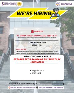 PT Dunia Setia Sandang Asli Tekstil IV (Duniatex) sedang mencari profesional muda yang siap berinovasi dan berkolaborasi. Jangan lewatkan kesempatan ini! Info lebih lanjut kunjungi hani.unika.ac.id dan klik menu “Jobs” untuk melihat info secara lebih jelas.