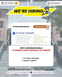 PT Perintis Karya Sentosa sedang mencari profesional muda yang siap berinovasi dan berkolaborasi. Jangan lewatkan kesempatan ini! Info lebih lanjut kunjungi hani.unika.ac.id dan klik menu “Jobs” untuk melihat info secara lebih jelas.