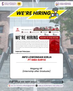 PT Siba Surya sedang mencari profesional muda yang siap berinovasi dan berkolaborasiJangan lewatkan kesempatan ini! Info lebih lanjut kunjungi hani.unika.ac.id dan klik menu “Jobs” untuk melihat info secara lebih jelas