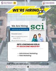 PT Solocone Industry sedang mencari profesional muda yang siap berinovasi dan berkolaborasi. Jangan lewatkan kesempatan ini! Info lebih lanjut kunjungi hani.unika.ac.id dan klik menu “Jobs” untuk melihat info secara lebih jelas.