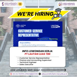 PT Lautan Luas Tbk sedang mencari profesional muda yang siap berinovasi dan berkolaborasi. Jangan lewatkan kesempatan ini! Info lebih lanjut kunjungi hani.unika.ac.id dan klik menu “Jobs” untuk melihat info secara lebih jelas.