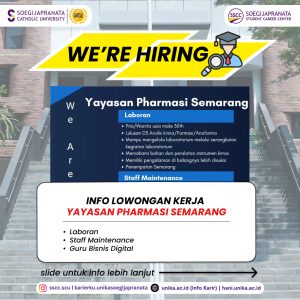 Yayasan Pharmasi Semarang sedang mencari profesional muda yang siap berinovasi dan berkolaborasi. Jangan lewatkan kesempatan ini! Info lebih lanjut kunjungi hani.unika.ac.id dan klik menu “Jobs” untuk melihat info secara lebih jelas.
