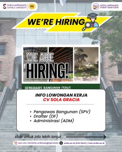 CV Sola Gracia sedang mencari profesional muda yang siap berinovasi dan berkolaborasi. Jangan lewatkan kesempatan ini! Info lebih lanjut kunjungi hani.unika.ac.id dan klik menu “Jobs” untuk melihat info secara lebih jelas.