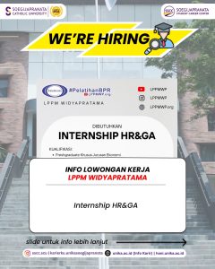 LPPM Widyapratama sedang mencari profesional muda yang siap berinovasi dan berkolaborasi. Jangan lewatkan kesempatan ini! Info lebih lanjut kunjungi hani.unika.ac.id dan klik menu “Jobs” untuk melihat info secara lebih jelas.