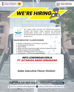 PT Jutarasa Abadi Semarang sedang mencari profesional muda yang siap berinovasi dan berkolaborasi. Jangan lewatkan kesempatan ini! Info lebih lanjut kunjungi hani.unika.ac.id dan klik menu “Jobs” untuk melihat info secara lebih jelas.