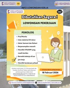 Soegijapranata Catholic University (SCU) sedang mencari profesional muda yang siap berinovasi dan berkolaborasi. Jangan lewatkan kesempatan ini! Info lebih lanjut kunjungi hani.unika.ac.id dan klik menu “Jobs” untuk melihat info secara lebih jelas.