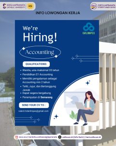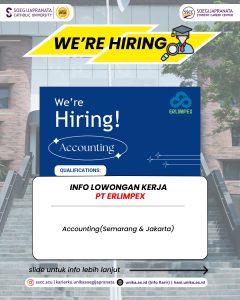 PT Erlimpex sedang mencari profesional muda yang siap berinovasi dan berkolaborasi. Jangan lewatkan kesempatan ini! Info lebih lanjut kunjungi http://hani.unika.ac.id dan klik menu “Jobs” untuk melihat info secara lebih jelas.