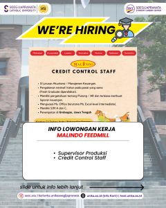 PT Malindo Feedmill Tbk sedang mencari profesional muda yang siap berinovasi dan berkolaborasi. Jangan lewatkan kesempatan ini! Info lebih lanjut kunjungi http://hani.unika.ac.id dan klik menu “Jobs” untuk melihat info secara lebih jelas.