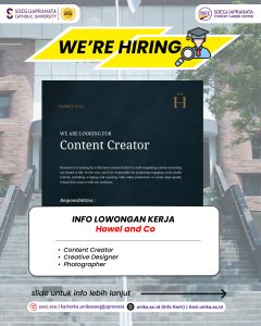 Howel and Co sedang mencari profesional muda yang siap berinovasi dan berkolaborasi. Jangan lewatkan kesempatan ini! Info lebih lanjut kunjungi hani.unika.ac.id dan klik menu “Jobs” untuk melihat info secara lebih jelas.