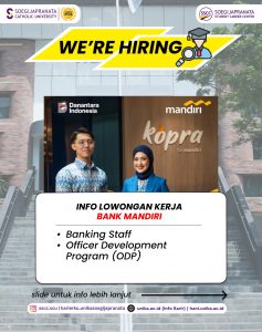 Bank Mandiri sedang mencari profesional muda yang siap berinovasi dan berkolaborasi. Jangan lewatkan kesempatan ini! Info lebih lanjut kunjungi hani.unika.ac.id dan klik menu “Jobs” untuk melihat info secara lebih jelas