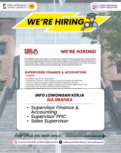 ISA GRAFIKA sedang mencari profesional muda yang siap berinovasi dan berkolaborasi. Jangan lewatkan kesempatan ini! Info lebih lanjut kunjungi hani.unika.ac.id dan klik menu “Jobs” untuk melihat info secara lebih jelas.