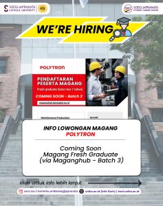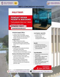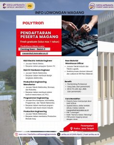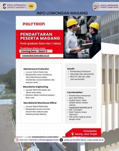 Polytron sedang mencari profesional muda yang siap berinovasi dan berkolaborasi. Jangan lewatkan kesempatan ini! Info lebih lanjut kunjungi hani.unika.ac.id dan klik menu “Jobs” untuk melihat info secara lebih jelas