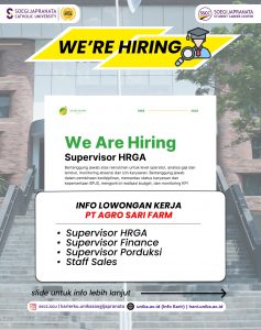 PT Agrosari Farm sedang mencari profesional muda yang siap berinovasi dan berkolaborasi. Jangan lewatkan kesempatan ini! Info lebih lanjut kunjungi hani.unika.ac.id dan klik menu “Jobs” untuk melihat info secara lebih jelas.