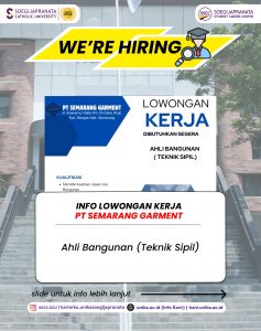 PT Semarang Garment sedang mencari profesional muda yang siap berinovasi dan berkolaborasi. Jangan lewatkan kesempatan ini! Info lebih lanjut kunjungi hani.unika.ac.id dan klik menu “Jobs” untuk melihat info secara lebih jelas.