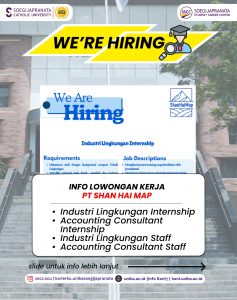 PT Shan Hai Map sedang mencari profesional muda yang siap berinovasi dan berkolaborasi. Jangan lewatkan kesempatan ini! Info lebih lanjut kunjungi hani.unika.ac.id dan klik menu “Jobs” untuk melihat info secara lebih jelas.