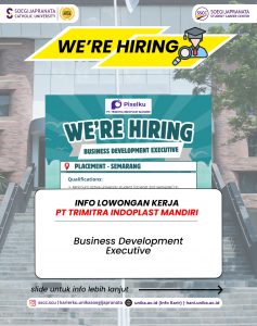 PT Trimitra Indoplast Mandiri sedang mencari profesional muda yang siap berinovasi dan berkolaborasi. Jangan lewatkan kesempatan ini! Info lebih lanjut kunjungi hani.unika.ac.id dan klik menu “Jobs” untuk melihat info secara lebih jelas.
