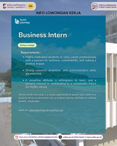 Bumi Journey sedang mencari profesional muda yang siap berinovasi dan berkolaborasi. Jangan lewatkan kesempatan ini! Info lebih lanjut kunjungi hani.unika.ac.id dan klik menu “Jobs” untuk melihat info secara lebih jelas.