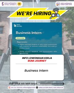 Bumi Journey sedang mencari profesional muda yang siap berinovasi dan berkolaborasi. Jangan lewatkan kesempatan ini! Info lebih lanjut kunjungi hani.unika.ac.id dan klik menu “Jobs” untuk melihat info secara lebih jelas.
