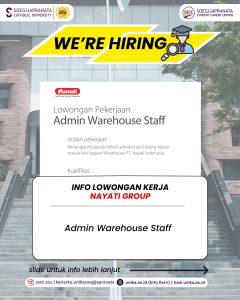 Nayati Group sedang mencari profesional muda yang siap berinovasi dan berkolaborasi. Jangan lewatkan kesempatan ini! Info lebih lanjut kunjungi hani.unika.ac.id dan klik menu “Jobs” untuk melihat info secara lebih jelas.