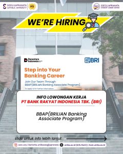 PT. Bank Rakyat Indonesia Tbk. (BRI) sedang mencari profesional muda yang siap berinovasi dan berkolaborasi. Jangan lewatkan kesempatan ini! Info lebih lanjut kunjungi hani.unika.ac.id dan klik menu “Jobs” untuk melihat info secara lebih jelas.