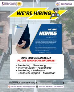 PT DES TEKNOLOGI INFORMASI (DESNET) sedang mencari profesional muda yang siap berinovasi dan berkolaborasi. Jangan lewatkan kesempatan ini! Info lebih lanjut kunjungi hani.unika.ac.id dan klik menu “Jobs” untuk melihat info secara lebih jelas.