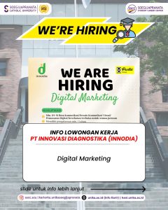 PT Innovasi Diagnostika (Innodia) sedang mencari profesional muda yang siap berinovasi dan berkolaborasi. Jangan lewatkan kesempatan ini! Info lebih lanjut kunjungi hani.unika.ac.id dan klik menu “Jobs” untuk melihat info secara lebih jelas.