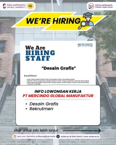 PT Mercindo Global Manufaktur sedang mencari profesional muda yang siap berinovasi dan berkolaborasi. Jangan lewatkan kesempatan ini! Info lebih lanjut kunjungi hani.unika.ac.id dan klik menu “Jobs” untuk melihat info secara lebih jelas.