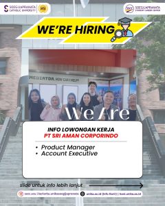 PT. Sri Aman Corporindo sedang mencari profesional muda yang siap berinovasi dan berkolaborasi. Jangan lewatkan kesempatan ini! Info lebih lanjut kunjungi hani.unika.ac.id dan klik menu “Jobs” untuk melihat info secara lebih jelas.
