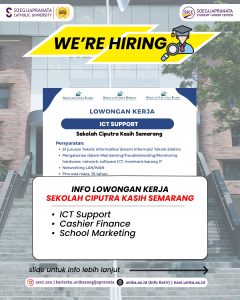 Sekolah Ciputra Kasih Semarang sedang mencari profesional muda yang siap berinovasi dan berkolaborasi. Jangan lewatkan kesempatan ini! Info lebih lanjut kunjungi hani.unika.ac.id dan klik menu “Jobs” untuk melihat info secara lebih jelas.