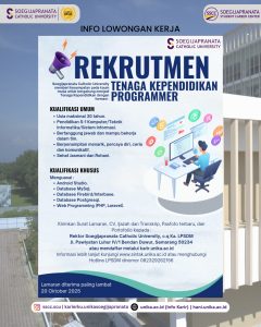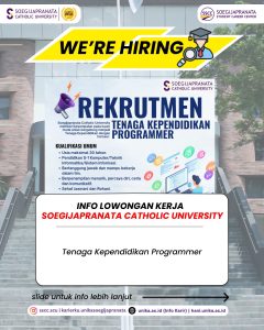Universitas Katolik Soegijapranata (SCU) sedang mencari profesional muda yang siap berinovasi dan berkolaborasi. Jangan lewatkan kesempatan ini! Info lebih lanjut kunjungi hani.unika.ac.id dan klik menu “Jobs” untuk melihat info secara lebih jelas.