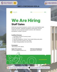 Agrosari Farm sedang mencari profesional muda yang siap berinovasi dan berkolaborasi. Jangan lewatkan kesempatan ini! Info lebih lanjut kunjungi http://hani.unika.ac.id dan klik menu “Jobs” untuk melihat info secara lebih jelas.