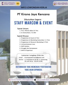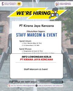 PT Kirana Jaya Kencana sedang mencari profesional muda yang siap berinovasi dan berkolaborasi. Jangan lewatkan kesempatan ini! Info lebih lanjut kunjungi http://hani.unika.ac.id dan klik menu “Jobs” untuk melihat info secara lebih jelas.