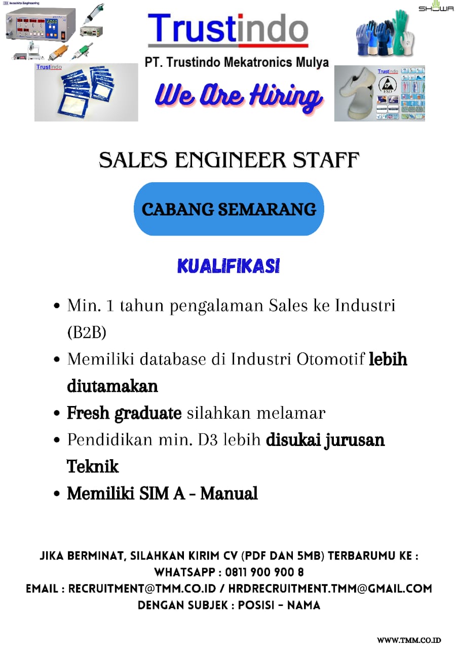 Lowongan Kerja Mei 2024 – PT. TRUSTINDO MEKATRONICS MULYA – Sales Engineer Staff