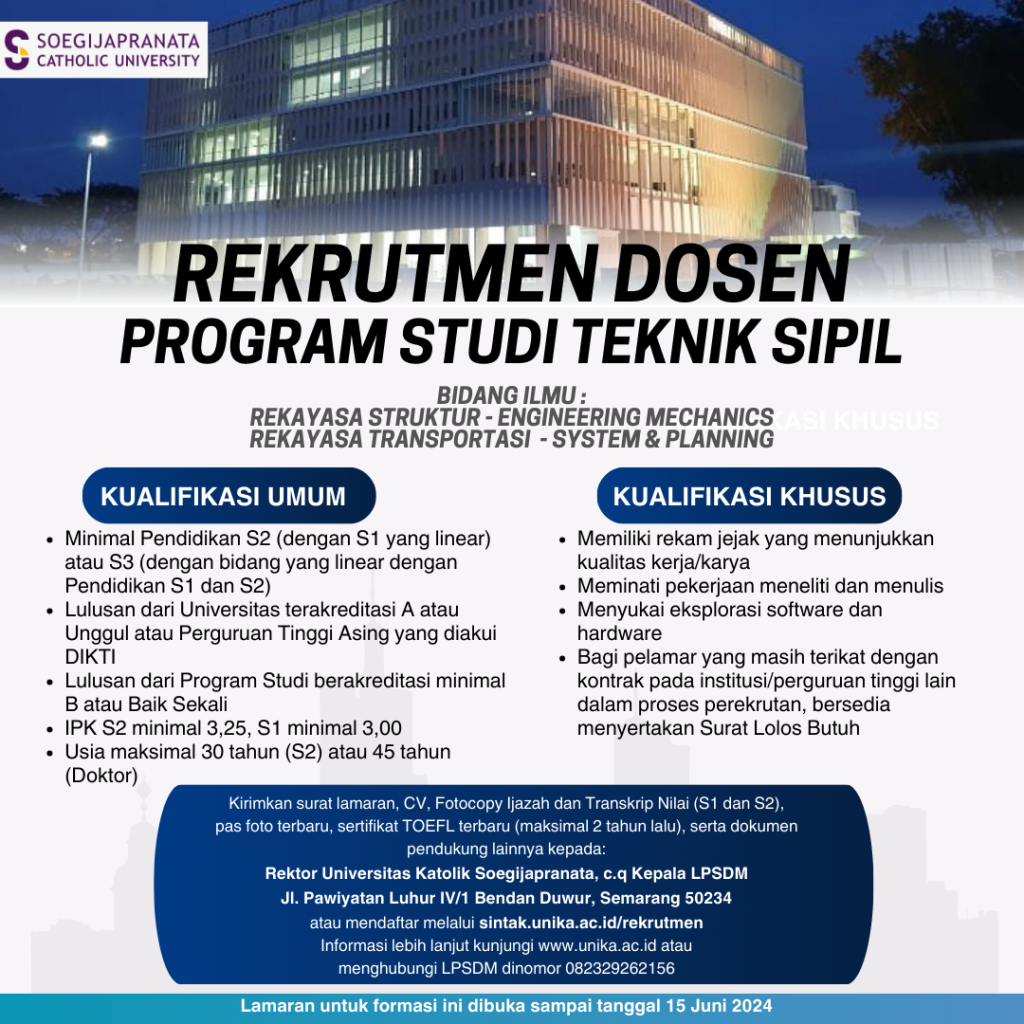 Lowongan Kerja Mei 2024 – Rekrutmen Dosen Teknik Sipil