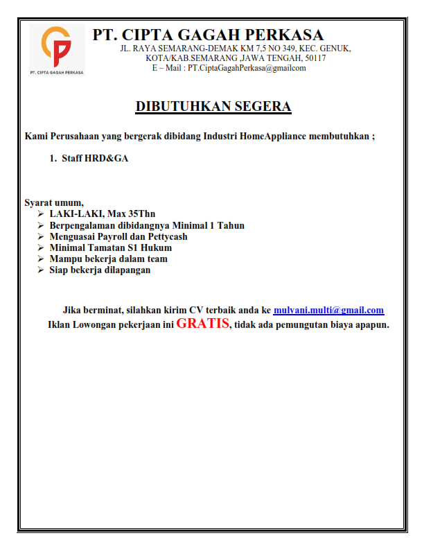 Staff HRD dan GA @ PT Cipta Gagah Perkasa