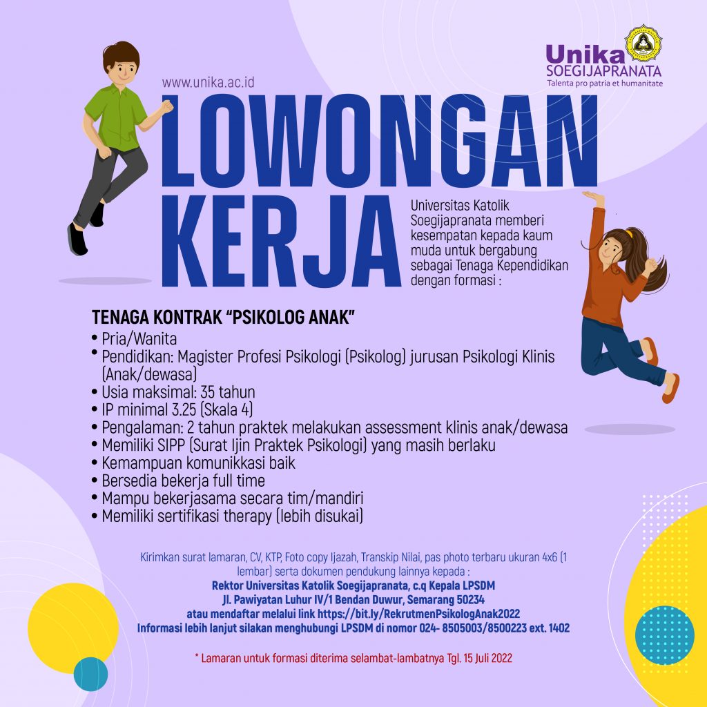 Universitas Katolik Soegijapranata memberi kesempatan kepada kaum muda untuk bergabung sebagai Tenaga Kontrak Psikolog Anak :