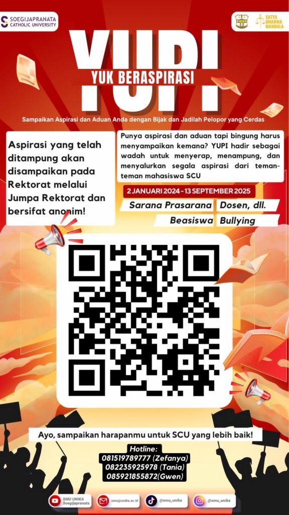 Senat Mahasiswa Universitas (SMU) Soegijapranata Catholic University (SCU) menghadirkan program “YUPI” (Yuk Beraspirasi) sebagai sarana untuk menampung aspirasi mahasiswa mengenai akademik, fasilitas, maupun isu kemahasiswaan.