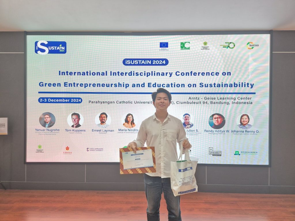 Mahasiswa Fakultas Teknologi Pertanian (FTP) Soegijapranata Catholic University (SCU) Henry Tan berhasil meraih Juara 1 dalam International Interdisciplinary Conference on Green Entrepreneurship and Education for Sustainability (iSustain) 2024. Kompetisi ini diselenggarakan Konsorsium Erasmus+ ECoGREEN bersama Universitas Katolik Parahyangan (UNPAR) Bandung pada 3 Desember 2024.