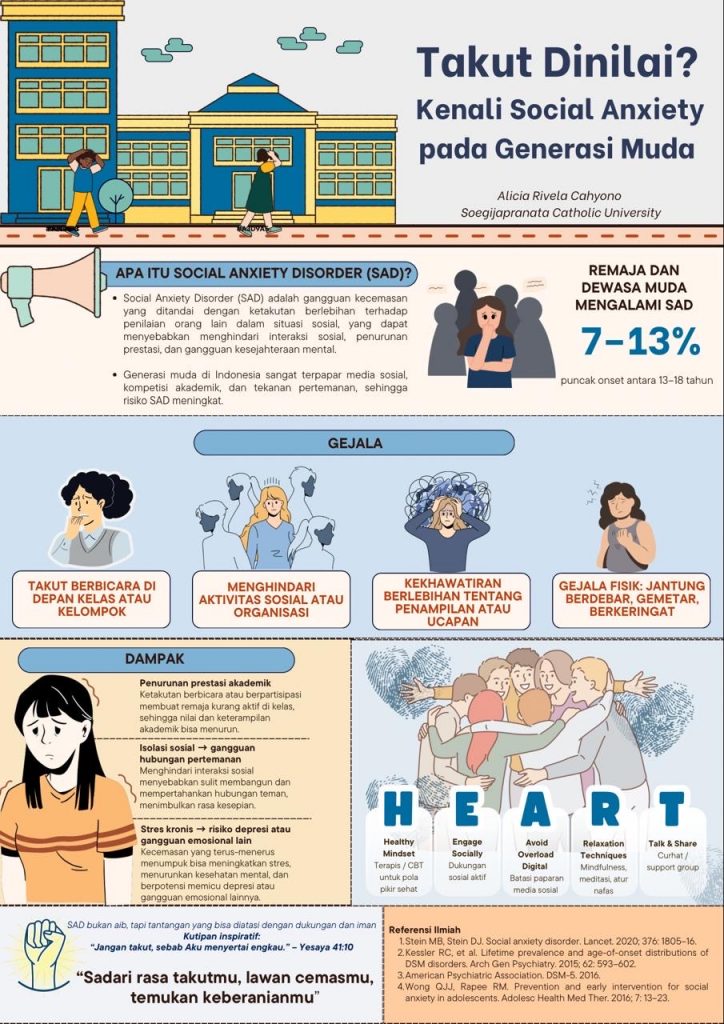 Ketakutan untuk dinilai orang lain kerap dianggap sepele, padahal bagi sebagian remaja dan dewasa muda, perasaan itu bisa berkembang menjadi gangguan kecemasan sosial atau social anxiety disorder (SAD). Isu inilah yang diangkat mahasiswa Fakultas Kedokteran (FK) Soegijapranata Catholic University (SCU), Alicia Rivela Cahyono, dalam posternya yang berjudul “Takut Dinilai? Kenali Social Anxiety pada Generasi Muda.” Karya Alicia ini berhasil memenangkan Juara 2 Kompetisi Poster Promosi Kesehatan Tingkat Nasional yang diselenggarakan Asosiasi Perguruan Tinggi Katolik (APTIK) pada 9 Oktober 2025.