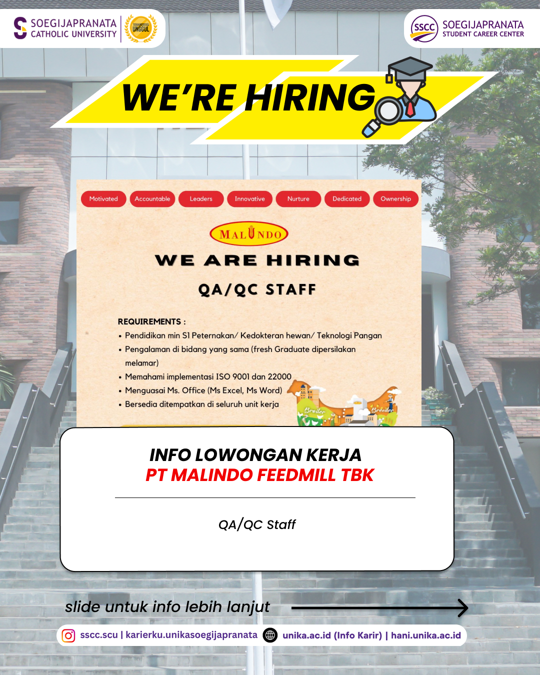 Hai Soegija Muda! PT Malindo Feedmill, Tbk sedang mencari profesional muda yang siap berinovasi dan berkolaborasi. Jangan lewatkan kesempatan ini! Info lebih lanjut kunjungi hani.unika.ac.id dan klik menu “Jobs” untuk melihat info secara lebih jelas. PT Malindo Feedmill, Tbk selalu menerapkan proses kontrol kualitas yang ketat sejak pemilihan bahan baku untuk memastikan hanya produk dengan kualitas terbaik… Continue reading Loker Juni 2025 – PT Malindo Feedmill || SPV Produksi