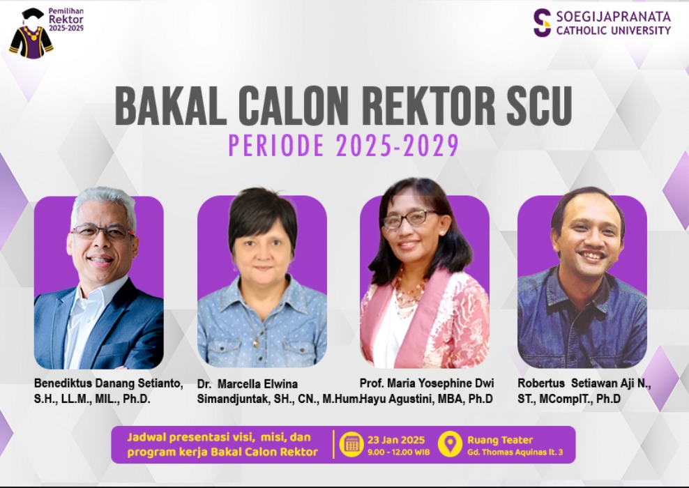 “Collaboration of a Joyful Campus, Joyful Future” menjadi semangat yang diusung Rektor Baru SCU Ir. Robertus Setiawan Aji Nugroho, S.T, M.CompIT, Ph.D saat periode kepemimpinannya pada 2025-2029. Dilantik pada Rabu, 27 Agustus 2025 di Teater Thomas Aquinas, Kampus 1 SCU Bendan bersama 4 wakil rektornya, Aji, sapaan akrabnya, mengatakan bahwa pihaknya ingin fokus memperkuat kolaborasi,… Continue reading Rektor SCU 2025-2029 Komitmen Kuatkan Kolaborasi untuk Siapkan Lulusan Jawab Kebutuhan Industri